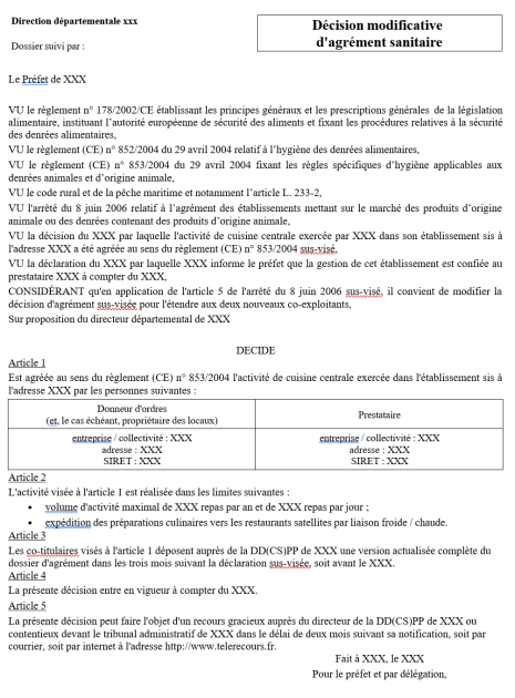 Annexe 3 - Modèle de décisionAnnexe 3 : Modèle de décision modificative d'agrément au bénéfice conjoint du responsable d'un établissement de restauration collective et de son prestataire